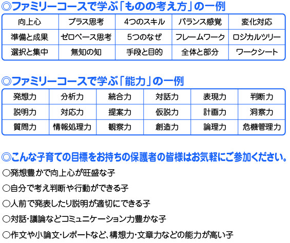 このセミナーでは、変化の激しい社会をしっかりと自立して生きていける「ものの考え方」や、これからの社会で必要とされる能力、学力等を理解し、保護者の皆様の子育てに活 用できるよう指導致します。